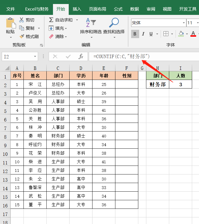 =COUNTIF(C:C,"财务部")
